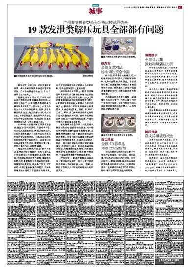 新快报讯 记者王彤 通讯员穗消宣报道 超七成解压玩具未通过安全检测项目。广州市消费者委员会10月21日通报了这一结果。 据通报,今年6月~9月,广州市消委会委托深圳市计量监督检测研究院,从网