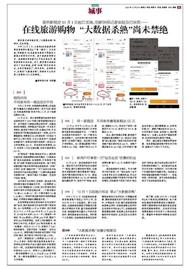 新快报记者体验发现,“大数据杀熟”的情况,还在持续。 今年10月1日,文旅部《在线旅游经营服务管理暂行规定》(下称“规定”)正式实施,明确规定“在线旅游经营者不得滥用大数据分析等技术手段,基于