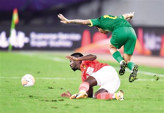 ■10月28日,北京中赫国安队球员金泰延(右)与广州恒大淘宝队球员费南多拼抢。新华社发 |