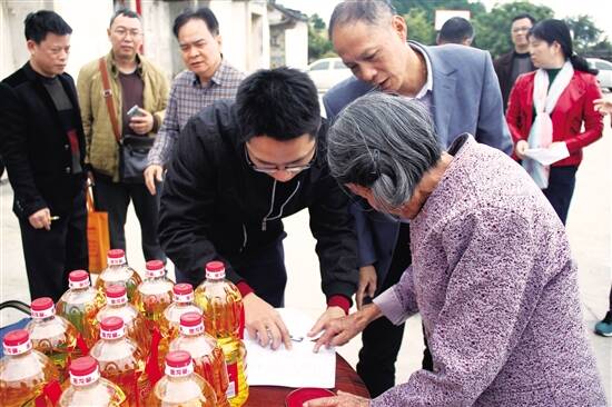 ■帮扶干部在潮州市湘桥区磷溪镇福聚村为贫困户发放油米面及慰问金。 |