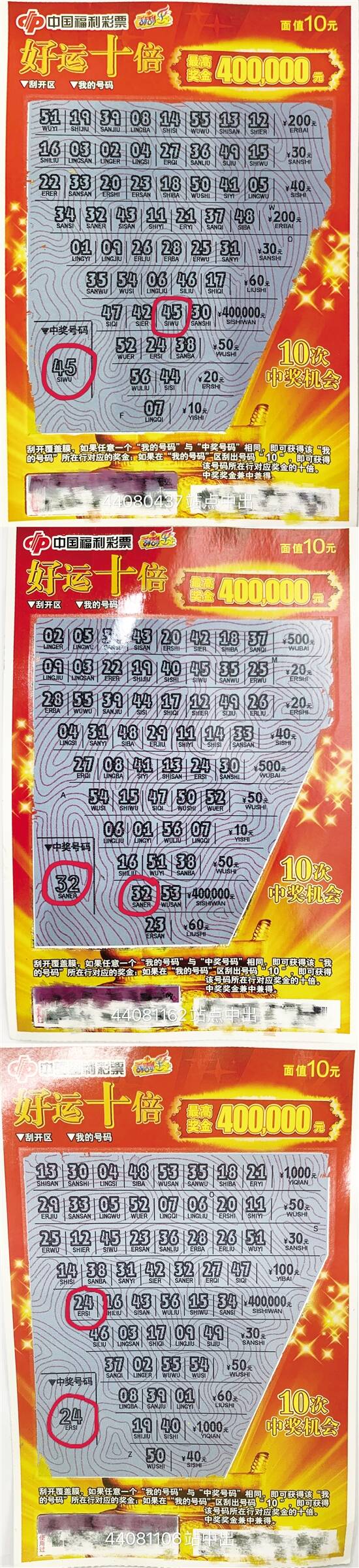 近日以来,中福彩中心及广东省福彩中心相继开展刮刮乐“超给力”系列票派奖活动和双色球2000万大赠票活动。虽然天气逐渐转凉,但这一波接一波的活动惊喜,着实让彩民的购彩热情持续升温。这不,就在一周内,惠州市福彩中心连续迎来了几个大奖。其中即开票“好运十倍”中出三个40万元最高奖。 ■新快报记者 陆妍思 通讯员 何乐 秉持平常心购彩,仅一票揽获大奖 10月18日是个大喜的日子,许多新人在当日喜结良缘。陈先生(化名)正是在这好日子里以一张“好运十倍”将40万元大奖收获囊中。 10月19日上午,陈先生便和博罗44080437投注站业主一同来到市福彩中心兑奖。在采访过程中,彩民和业主其乐融融,你一言我一语地说着购彩经历。“陈先生在本站购彩已经有五六年了,一个星期会来店里两三次,老规矩双色球随机10元,‘刮刮乐’来上一本。但唯独昨天,他出奇地仅挑了一张‘好运十倍’,没想到就是这一张中出了一等奖!当时在店里的其他彩民都跟着一块儿高兴!”业主郑先生脸上蔓延着喜悦。 陈先生在边上抿起嘴腼腆地笑着,他接着说道:“中奖了自然是开心的,但这些都是可遇而不可求的。一直以来我都把购彩当作一种娱乐,不会太在意是否中奖,而且平常投注并不多,没有中奖的话等于将钱捐给社会,娱乐和助人两不误。” 坚持职业操守赢得彩民持久信任 44080437投注站业主郑先生继续介绍到,当时是晚上刮出的大奖,本着为彩民切身利益着想,郑先生按照兑奖规定,仔细检查票面,并用扫描枪进行兑奖扫描,核对票面真实性。核对无误后让陈先生在票背面写上姓名和身份证号码,与此同时说明兑奖流程,并约定次日早带领陈先生到市福彩中心兑奖。 “干一行就要爱一行,我从事彩票行业已经10年,入行之初就十分清楚这是一个服务性行业,只有把彩民放在第一位,坚持为彩民做好服务,主动为彩民介绍各类票种,让彩民买得舒心,才能长久维持与彩民的联系。”郑先生娓娓道来。 好运加码,再喜添两个头奖 “好运十倍”这次可真是铆足了劲!继10月19日爆出一等奖后,紧接着位于仲恺高新区的44081162和44081106投注站又爆出“好运十倍”一等奖。更巧的是,44081106投注站中奖彩民李先生(化名)同样以一张“好运十倍”就“拿”下了40万元,业主与彩民齐齐到中心办理兑奖,一同分享这份幸运。“彩民能中奖,我比他本人还高兴,李先生在我店也购彩七八年了,大家早已经成为朋友!”业主在兑奖结束后说道。 这次“好运十倍”连续中出三个头奖,为惠州市即开票市场打了一剂强心针,极大增加了投注站销售信心。