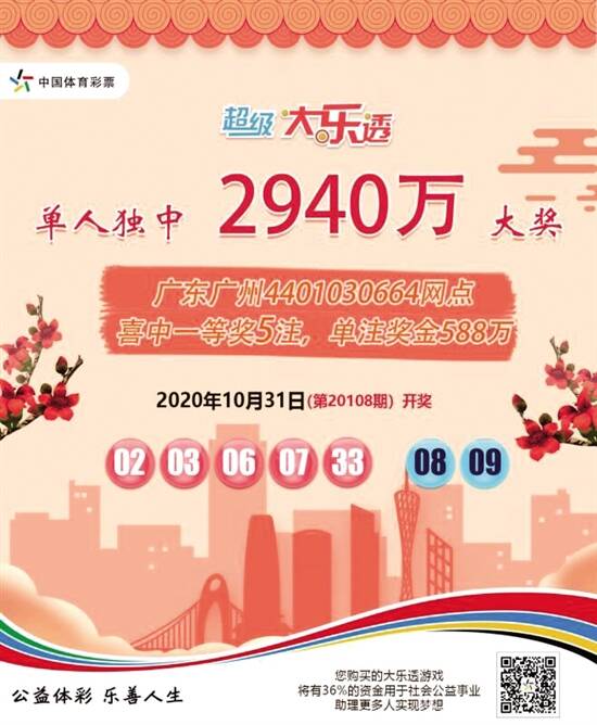 新快报讯 记者陆妍思报道 10月31日,体彩大乐透第20108期开奖,广州一位购彩者10元揽获5注588万多元一等奖,总奖金2940万! 当期大乐透摇出中奖号码为:前区“02、03、06、07、33”;后区“08、09”。当期全国销量达到3.04亿元,为国家筹集彩票公益金1.09亿元。 全国共开出13注一等奖。其中,7注为1058万元(含470万元追加奖金)追加投注一等奖,出自吉林长春(5注)、江苏南京、云南西双版纳;6注为588万元基本投注一等奖,出自广东广州(5注)、江苏苏州。 广州中出的5注基本一等奖均花落西湾路134号4401030664体彩实体店,且出自同一张彩票,中奖的彩票是一张10元5倍投单式票,总揽奖金2940万元。 同期二等奖开出80注,每注奖金16.45万元;其中37注采用追加投注,每注多得奖金13.16万元。追加后,二等奖单注总奖金29.61万元。 奖池方面,本期开奖结束后,5.65亿元滚存至11月2日(周一)开奖的第20109期。