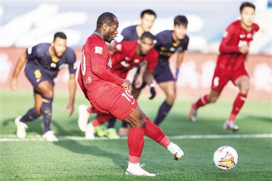 ■11月1日,河南建业队球员巴索戈(前)在比赛中主罚点球破门。新华社发 |