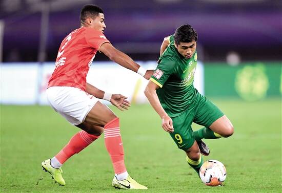 ■第一战中,北京中赫国安队球员张玉宁(右)带球突破广州恒大淘宝队球员蒋光太的防守。新华社发 |