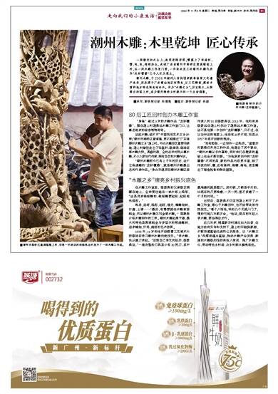 一根镂空的木头上,渔网若隐若现,蟹篓上下布满虾、蟹、龟、鱼,栩栩如生。走进广东省潮州市湘桥区意溪镇莲上村,在一间木雕工作室门前,一件尚未完工的潮州木雕代表作“龙虾蟹篓”已令人叹为观止。 潮州木