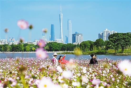 秋凉无碍 羊城花开 ■近日,广州“绿心”——海珠湿地海珠湖的波斯菊花海竞相绽放,成为市民休闲好去处。新华社发