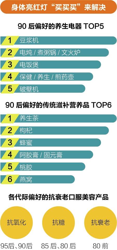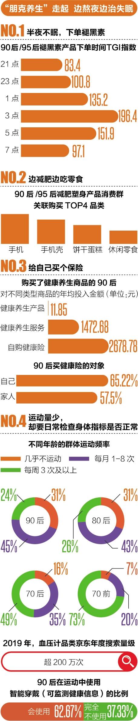 保健品并非中老年人专属产品,滋补营养品也受到年轻人喜爱。具体而言,购买健康养生产品的90后中,38%的人会购买保健品,27.33%的人会购买相关食物,还有24.67%的人会购买中药饮片类产品。 为了健康美丽常驻,青年人早早地吃上了保健品。据艾瑞数据,针对增强免疫、骨骼健康的保健品同时受到男女性、各个年龄阶层的偏爱。而16-35岁的群体还会更偏爱运动营养、减肥塑身和美容养颜类型的保健品,36岁-45岁的群体开始注重调节三高,46岁及以上的人群则更加注重抗氧化和补肾强身。而在90后偏好的滋补营养品中,传统的养生茶、枸杞、阿胶膏、燕窝也一样不少。 跟上时代新潮流的青年人还在用各类创新的养生产品。在运动中,超六成的90后会使用智能穿戴设备,以获取各种健康信息。线上健身也备受年轻人喜爱。易观分析数据显示,90后人群会集中在傍晚6点至晚上9点之间使用线上健身应用。为了在饮食方面达到养生目的,80后、90后还喜欢购买养生电器。其中,豆浆机、煮粥锅、电饭煲、养生壶和破壁机最受90后喜爱。 各种美容塑形服务消费也记录着各个年龄层对美的追求。其中,16-25岁的年轻消费者喜好使用瘦脸针和抽脂塑形类服务,26岁-35岁的消费者特别偏爱植发及纹眉。消费者年龄越大,便越爱消费玻尿酸。 青年特色朋克养生: 不爱运动爱买保险 在养生问题上,众多年轻人出现了矛盾的表现。有人熬夜购买褪黑素(可改善睡眠);有人边吃减肥药边购买高热量的零食;有人缺少运动,却试图通过购买健康保险来给自己的健康多一份保障。“朋克养生“的概念便用来形容这一类矛盾的行为。 与身体力行的老年人相比,青年人的养生实在不够彻底。丁香医生及健康报移动健康研究院调研的数据显示,七成以上的70前人群每周运动3次及以上,而且偏好在公共体育场所运动,享受阳光和新鲜空气。仅7%的70前几乎不运动。而90后及80后群体几乎不运动的比例均达到三成左右,只有24%的90后每周运动至少3次。同时,年龄层次越低的人群越喜欢在室内健身房、家里等室内场所进行运动。 健康的生活习惯让中老年人拥有部分更好的身体指标。有数据显示,虽然中老年人普遍面临睡眠易醒的问题,但80前的人群仍明显对自身的睡眠质量、饮食感到满意。而即便90后拥有长达7.4小时的平均睡眠时间,超过八成的90后和80后都遇到了睡眠困扰。其中,26%的90后入睡困难,23%的80后醒来后感到腰酸背痛。分别有超三成90后和80后人群因为晚上睡不好,而影响到隔天的工作状态和情绪状态。饮食上,在更富裕的年代成长起来的80后和90后也并没有吃得更好,近四成的90后受到肠胃不好的困扰。 但在最后一道的保险上,青年人却很认真地给自己花钱。丁香医生及健康报移动健康研究院调研的数据显示,在公众人群中,有27%的人购买了健康险。其中,80后购买的比例最高,达到了36%。90后购买健康险的比例也达到21%,高于70前的18%。 80后和90后的健康险花费也明显更高。其中,70前最省钱,30%买了健康险的70前花费一千元以内,8%的人花费一万元以上。90后和80后为健康险花费超一万元的比例,则分别达到19%和23%。 均衡饮食、睡眠改善、多运动才是健康正解 一边缺少运动、睡眠不佳,一边又希冀于买买买解决健康问题,不少青年人陷入“养生而不得”的怪圈。有专家指出,要改善饮食状况、重视睡眠及适度运动,才能真正得到一个健康健美的好身体。 丁香医生及健康报移动健康研究院调研的数据显示,基于中国人的饮食习惯,精细主食的食用比例较高,杂粮、海鲜、大豆坚果类食用比例较低。食品与营养信息交流中心科学技术部主任阮光锋指出,全谷物可提供更多B族维生素、矿物质等营养成分,应均衡饮食,以保持营养均衡和控制健康体重。由于工作和生活压力,肥胖、焦虑、肠胃不好等问题越来越低龄化,但各种节食及网红减肥法可能会导致营养不良等健康问题。长期而言,减肥的根本路径是控制总能量的收支平衡。 至于睡眠问题,有数据则显示,半数有睡眠困扰的人群会通过规范睡眠时间来改善睡眠问题。此外,借助枕头、床垫、香薰灯辅助工具的做法也得到不少失眠者的喜爱。但仍有27%的人并没有采取行动应对睡眠困扰。北京协和医院神经内科主任医师、副教授王含表示,目前睡眠已成为中青年公众最在意的健康问题。而认知行为治疗是治疗成年人慢性失眠的首选方案之一,首要的措施便是纠正不良的睡眠卫生习惯。例如,睡前4-6小时不要饮用兴奋性物质或暴饮暴食,也不要用酒精助眠。要适度锻炼,保持良好规律作息。 年轻群体的低运动参与度也拉响了健康的警钟。首都医科大学附属北京友谊医院、骨科主治医师齐峥嵘表示,“工作忙”限制了年轻人的运动时间,但另一方面,“我还年轻,疾病还远”的错觉也成为了不运动的借口。事实上,上班族由于久坐、低头、不爱运动等不良习惯,已经成为颈腰痛、肥胖等问题的高发人群。其中,女性如果没有在年轻时通过运动储备足够的峰值骨量,未来会更容易罹患骨质疏松症。因此,呼吁80、90后的年轻人能够抽出时间真正投入到体育运动中。 ■参考数据:艾瑞咨询《2019年中国大健康消费发展白皮书》、 CBNData《年轻人养生消费趋势报告》、易观分析《90后健康养生大揭秘》、丁香医生&健康报《2019国民健康洞察报告》 就算朋克养生也好过不管不顾,