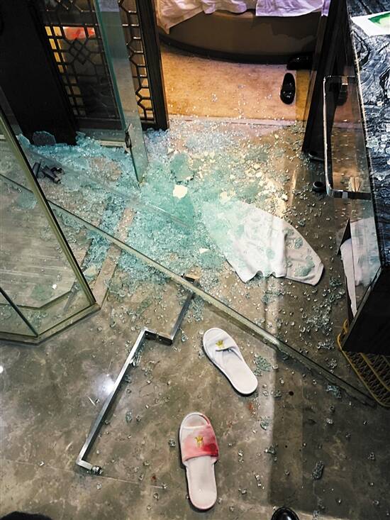 ■浴室内碎玻璃散落在地上,地上还有点点血迹。 |
