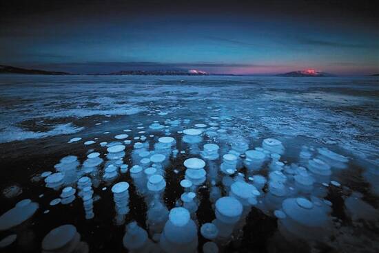 ▶2018年1月,为了拍摄赛里木湖的冰泡,沈久泉和妻子在零下41℃的天气里,跪在冰面上,用布擦干净冰面,拍摄下中国唯一的冰泡湖。 |
