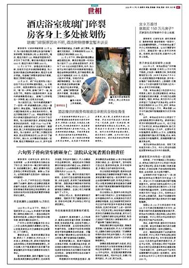 酒店浴室玻璃门碎裂 房客身上多处被划伤