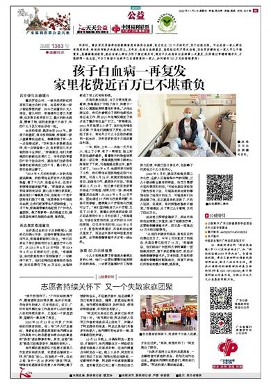 温暖1383号 ●温暖诉求 四岁时, 肇庆罗定男孩李杰浩被确诊患有高危白血病,经过长达10个月的化疗,终于治愈出院。可让杰浩一家人都没有想到的是,命运的考验并未就此终止。五年后,杰浩白血病