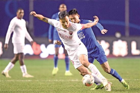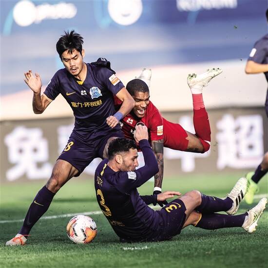 ■富力队球员弋腾(左一)与建业队球员卡兰加(右上)拼抢中。新华社发 |