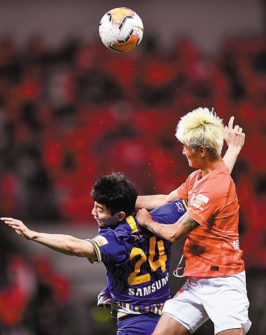 ■广州恒大球员韦世豪(右)与江苏苏宁球员吉翔在比赛中争顶。新华社图 |
