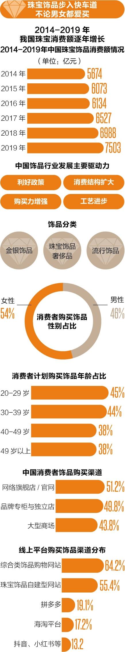 伴随居民购买力的增强和现代工艺的进步,珠宝作为能够满足精神需求的产品日益受到消费者的喜爱。数据显示,2014-2019年,我国珠宝消费额逐年增长,2019年达到7503亿元,年轻群体成为珠宝消费主力军,沿海城市在珠宝生产商数量方面遥遥领先。 与此同时,国内珠宝饰品行业也存在产品来源不规范、行业集中度不高、质量不过关等乱象。二三线城市所具备的强大消费活力,与其市场份额并不匹配。这也意味着,伴随着珠宝公司渠道门店下沉,低线城市珠宝饰品渗透率有望进一步提升。 ■策划:新快报记者 罗韵 ■统筹:新快报记者 罗韵 ■采写:新快报记者 张磊 ■制图:廖木兴 珠宝销售近年来量价齐升,线上购买大受年轻消费者欢迎 近年来,珠宝饰品逐渐从奢侈品向潮流品转变,成为年轻群体日常搭配和彰显个性化的标志。数据显示,自2017年起,我国珠宝销售单价逐年增长,呈现出量价齐升的趋势。2019年我国珠宝销售单价为1119.85件/元。珠宝饰品2019年市场规模为7843亿元,同比增长率为12.6%。预计到2020年将突破8000亿元。究其原因,随着中产阶层的不断扩大,人们对珠宝的品质要求更高,高奢珠宝需求也随之逐渐增加。 国民收入水平是影响居民消费最重要的因素之一,居民人均收入的增长有利于推动饰品市场的蓬勃发展。近五年来,中国居民人均可支配收入连续增长。2019年,中国居民人均可支配收入为30733元,同比增长8.9%。此外,政府政策支持、珠宝制作工艺进步、消费结构扩大等原因也促使珠宝饰品的发展迎来新机遇。 相比欧美发达国家,我国的人均珠宝需求仍有较大的增长空间。艾媒数据显示,2018年美国人均钻石珠宝需求为110美元/人,日本为39美元/人,而中国仅为7美元/人。 伴随着我国互联网经济快速发展,KOL种草、直播带货等新模式的兴起,线上珠宝销售规模逐渐扩大。在中国消费者最常购买饰品的渠道中,网络旗舰店/品牌官网等线上购物占比最高。此外,品牌专柜和独立店、大型商城专柜也颇受欢迎。2019年,珠宝已跻身成为淘宝直播各类交易额品类第二名,线上渠道已然成为了珠宝行业销售增长的新来源。艾媒咨询分析师认为,年轻消费者习惯线上购物,建设线上渠道有利于重塑品牌调性,打入年轻消费者群体,同时也不能忽视对品牌专柜、大型商场专柜的布局。 年轻群体成为消费主力,广东省是珠宝饰品生产“老大哥” 在普遍优渥环境成长起来的年轻群体已经成为各个领域的消费主力。《Z世代消费力白皮书》显示,2020年,中国“Z世代”人群将占据中国整体消费力的40%,同时,在品类消费上,Z世代已逐渐追平95前人群。2019年,Z世代对饰品消费方面,离95前人群仅差3个百分点。而从宝格丽、蒂芙尼等品牌进行营销年轻化的策略也可以表明,年轻群体对珠宝厂商的销售额影响颇大。 从珠宝厂商生产地分析来看,中国珠宝饰品生产产业主要分布在珠三角、长三角及环渤海地区。其中,广东省金银珠宝生产企业占比近三成。此外,中国饰品生产企业规模较小,超六成企业注册资本不足500万元,5000万元注册资本的企业仅占8%,这一定程度说明国内的珠宝饰品业多以家族规模传承,融资上市的较少。 此外,在中国饰品地域关注度中,珠三角、长三角及环渤海地区的消费者同样拔得头筹,上海、浙江及广东省稳居前三位置。值得关注的是,随着国民收入水平的提升,三、四线城市居民对于珠宝的购买欲望不断增长,河南、甘肃、贵州等省份有望成为饰品市场的新蓝海。 2020年上半年中,国内主要黄金珠宝上市企业营收情况方面,老凤祥以264.87亿元登顶营收最高位,豫园股份紧随其后,营收为200.54亿元。受疫情的影响,上半年主要黄金珠宝上市企业营收增长情况不佳,多数企业出现负增长,其中,金一文化营收同比下降66.45%。