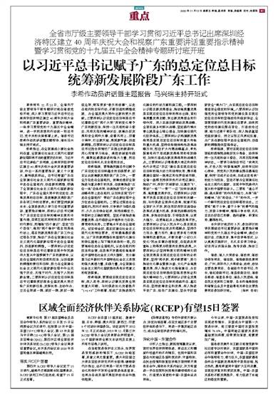 新快报讯 11月12日,全省市厅级主要领导干部专题研讨班在省委党校开班,深入学习贯彻习近平总书记出席深圳经济特区建立40周年庆祝大会和视察广东重要讲话、重要指示精神,一体学习贯彻党的十九届五中全会