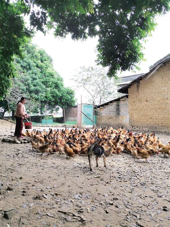 ■黄增辉一家靠养殖杏花鸡,年增收入超3万元,成了村里的致富带头人。图为女主人梁艳芝在喂鸡。 |