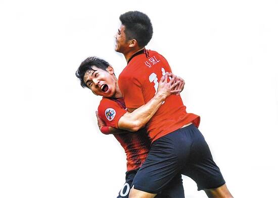 ■上海上港队球员李圣龙(右)在进球后与队友杨世元庆祝。 新华社发 |