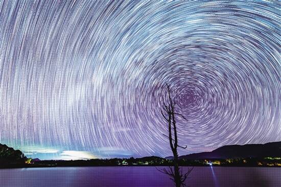 这是在念湖拍摄的星轨。念湖位于云南省曲靖市会泽县境内,海拔约2500米。冬日里,念湖清澈透亮的湖水与水草、树木、山峦、村庄形成一幅美丽的画卷。