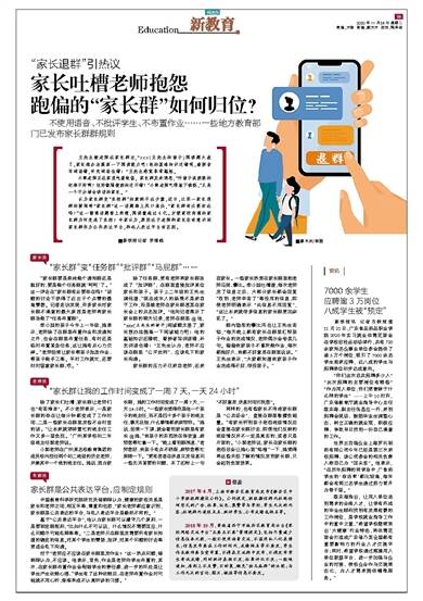 ■新快报记者 罗清峣 王先生被老师在家长群@,“xxx(王先生的孩子)阅读题太差了,家长想办法提高一下阅读能力吧!他的基础知识还错呢,看拼音写词语错,补充词语也错!”王先生感觉非常尴尬。 小郭老师正在家里吃着晚饭,家长群发来消息:“听孩子说班级的纪律不好啊?但好像隔壁班的还不错?”小郭老师气得放下碗筷,“又是一个不分场合讲话的家长。” 认为家长群变“负担群”的案例不在少数,近日,江苏一家长退群的新闻将“家长群”这一话题推上风口浪尖,“家长群有必要存在吗?”这一微博话题登上热搜,阅读量超过4亿。方便家校沟通的家长群为何变成了负担?专家认为,原因在于老师和家长没有意识到家长群作为公共表达平台,和私人表达平台有区别。 家长说 “家长群”变“任务群”“批评群”“马屁群”…… “家长群要是单纯做个通知群还是挺好的,要是做个任务群就‘呵呵’了。”这一评论在“家长群有必要存在吗?”话题的讨论下获得了近五千个点赞的最高赞数。记者走访发现,许多家长对家长群不满意的最大原因是老师将家长群当做了“任务布置群”。 李小姐的孩子今年上一年级,她表示,老师除了在群里布置作业和发通知之外,也会在群里布置任务,有时还是临时布置紧急任务,这让她有点心力交瘁。“老师经常让家长帮孩子批改作业、帮孩子做手工等。平时工作就忙,还要时时留意家长群,哎。” 除了任务群,更有老师将家长群当成了“批评群”,在群里直接批评某位家长和孩子。孩子上二年级的王先生调侃道,“现在成年人的崩溃不是来自于工作,而是被老师在家长群甚至在家长会上的点名批评。”他向记者展示了家长群的聊天记录,老师在群里@他,“xxx(王先生的孩子)阅读题太差了,家长想办法提高一下阅读能力吧!他的基础知识还错呢,看拼音写词语错,补充词语也错!”王先生认为,老师不应该在群里“公开处刑”,应该私下和家长沟通。 家长群的压力不仅来自老师,还来自家长。一些家长热衷在家长群里拍老师马屁、攀比。李小姐吐槽道,每次老师发了信息之后,大部分家长都会回复“收到,老师辛苦了”等没用的信息,即使老师明确表示“此信息不用回复”,“这让本来就很多信息的家长群更加杂乱了。” 群内隐形的攀比风也让王先生苦恼,“每天晚上都有家长在群里汇报孩子作业的完成情况,老师偶尔会夸奖几句。偏偏我家孩子不喜欢做作业,每次都拖好久,我都不好意思在群里说话。”王先生表示,“大家都知道我家孩子作业完成得不好,很没面子。” 老师说 “家长群让我的工作时间变成了一周7天,一天24小时” 除了家长们吐槽,家长群让老师们也“有苦难言”。不少老师表示,一是家长群的存在让每分钟都变成了工作时间,二是一些家长在群里发些不合时宜的话。“让本来就琐碎繁忙的班主任工作又多一层负担。”广州某学校初二年级班主任郭老师说。 小郭老师在广州某名校教育集团的成员校内担任两个初二班级的历史老师,并兼其中一个班的班主任。她说,因为家长群,她的工作时间变成了一周7天,一天24小时。“一些家长觉得你是他一个孩子的班主任,而不是四十多个孩子的班主任,事无巨细,什么事情都来麻烦你。”她说,经常一下课,就会看到家长群里有家长@她,“我孩子的东西放在保安室,麻烦您帮忙拿一下。”晚上看到群消息,“老师您好,我孩子有点不舒服,麻烦您帮忙照顾一下。”更有甚者在休息日发信息问一些无关紧要的问题,末了还附上一句“不好意思,休息时间打扰您”。 同样的,也有些家长不考虑家长群是“公共场合”,直接在群里散播负能量。“有家长听到孩子抱怨班级情况后会直接在家长群讨论,即便他们反映的班级情况并不一定是真实的,或者只是片面的。”小郭老师说,家长在家长群的抱怨总会让她心里“咯噔”一下,她觉得将这些未经了解的情况发到家长群,只会起到负面效果。 专家说 家长群是公共表达平台,应制定规则 中国教育科学研究院研究员储朝晖认为,健康的家校关系是家长和老师之间,相互平等、尊重和包容,“家长老师都应意识到,家长群是公共表达的平台,与私人表达平台是截然不同的。” 基于“公共表达平台”,他认为家长群可以遵守几个原则:一是要制定群规则,“比如什么不可以说,什么情况不需要回应,什么问题尽可能私聊等等。”二是老师只在群里发需要所有家长知道的确定的信息。对某个学生的赞扬、批评,对某个问题的讨论等更适合私下沟通。 对于“老师应不应该在家长群里发作业?”这一热点问题,储朝晖认为,不应该。他表示,首先,作业是老师向学生布置的,其次,在家长群布置作业会削弱学生的责任感,进一步的坏处是让学生产生依赖心理,“学生有了这种依赖后,在老师布置作业时可能就不用心听,渐渐养成不认真听讲的习惯。” 借鉴 2017年4月,上海市静安区教育局发布《静安区中小学班级群建设公约》。公约规定,班级微信群内杜绝任何形式的广告、拉票、红包、集赞等与学校、学生无关的内容;杜绝群内通报点名、批评学生、公布成绩或排名等。 2018年10月,青海省西宁市城西区教育局出台《家校网络交流平台“五要五不要”管理规定》,包括尽量减少信息往来次数,一般不使用语音交流,不滥用私人化表情包;信息发布要在工作时间内,成绩排名等不要发,学生