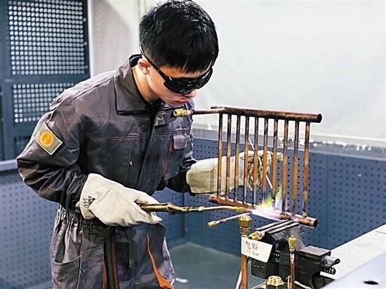 ■制冷与空调项目参赛选手、广州工贸学生阮康正戴着专业墨镜,对制冷设备的铜管进行加工焊接。新快报记者 李小萌/摄 |