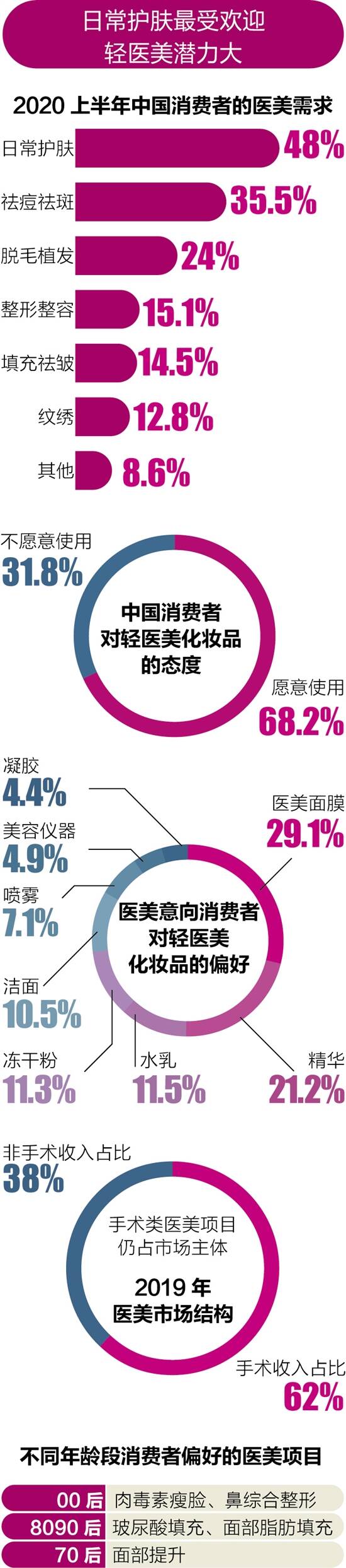 颜值经济崛起,让医疗美容这一“立竿见影”的美容方式得到了青睐。明星整容已不再稀奇,普通消费者则更偏好用医美进行日常护肤、祛斑祛痘等。相比于普通美容,医美一般会使用具有创伤性或侵入性的医学技术,这也使得不正规的医美机构或制品容易对消费者造成巨大伤害。 近年来,各种医美机构如雨后春笋般冒出,但鱼目混珠、层次不齐。有数据显示,目前医美市场由中小型民营机构主导,整形医生数量少,非法针剂和设备使用率较高。消费者不仅可能因舆论而产生压力,而且普遍担心医美效果和后遗症等问题。在选择医美项目的时候,消费者应该提高辨别能力,对自身需求、医美项目及机构资质有充分的认知和判断。 颜值经济崛起! 超七成消费者不反对医美 国家卫计委《医疗美容管理办法》指出,医疗美容是指运用手术、药物、医疗器械以及其他具有创伤性或者侵入性的医学技术方法对人的容貌和人体各部位形态进行的修复与再塑。据相关报告,目前医美项目大致分为手术类和非手术类两种。前者包括鼻整形、口腔牙齿矫正等面部手术,隆胸等胸部手术以及吸脂等身体手术。后者则包括肉毒素等注射类、光子嫩肤等非注射类和针灸等中医项目。 “爱美”的需求催生了一个巨大的市场。1997年,国内首家民营整形美容医院才出现。2010年起,国内医美行业便进入高速发展期,各类医美APP和新兴机构出现。艾媒咨询数据显示,去年国内医美市场的用户规模达到1120万人,这个规模还在不断增长。一方面,90后人群成为求美的主力军,年纪增长的中产人群也有了医美抗衰的需求。另一方面,互联网医美平台推动行业信息透明化,消费环境得以改善。 据艾媒咨询调查,今年上半年,国内超七成消费者并不反对医美消费。其中,11.6%的消费者认为医美越美越好,23.6%的消费者认为医美只要不过度就好。只有17%的消费者较反对医美,认为有较大缺陷才需医美或自然的脸蛋和身材才最美。艾瑞咨询数据显示,在疫情高峰期过后,新白领人群便迫不及待出门做医美了。在疫情高峰期后旅游、外出就餐等品类消费支出减少的同时,新白领对医美的投入却有所增长。 消费者选择医美的原因也值得关注。有数据显示,约半数消费者是因为变美能取悦自己而选择医美。在外界影响层面上,则有近三成的消费者是为了以更美的外貌获得优待,迎合当下的审美潮流而选择医美。 要变美但不想整容? “轻医美”接受度高 医美需求上,国内消费者则更偏向日常护肤、祛痘祛斑、脱毛植发等。具体而言,医美消费者最热衷于选择祛痘祛斑、牙齿整形、光子嫩肤和抗衰老美容。其中,有四成以上的医美消费者在今年上半年进行了祛痘祛斑,而进行五官/轮廓整形以及微整形美容的医美消费者分别只有19.4%和15.7%。 由于“轻医美”有风险较小、恢复期较短等优点,越来越多的消费者接受了这种医美形式。同时,由于“轻医美”无需手术,且具有高频低价的特点,目前其已成为更加生活化的一类医美项目。其中,“轻医美”皮肤护理包含注射玻尿酸、淡斑等,基础美容仪器包含洗脸仪、按摩仪等。“轻医美”项目还包括牙齿美容、脂肪填充、光电项目和整容手术后可使用的修复型产品等,医美化妆品则是化妆品与具有医学背景的原料的创新结合。 有数据显示,国内医美意向消费者愿意使用美容仪器、凝胶等医美化妆品的比例达到68.2%。艾媒分析师指出,中国已成为全球最大的“轻医美”市场。考虑到医美产业价值链各节点的现状和痛点,判断中游的医美机构未来变革方向会是重点发展“轻医美”,引入前沿设备及产品来提升利润空间,打造标准化模式。 ■策划:新快报记者 罗韵 ■统筹:新快报记者 罗韵 ■采写:新快报记者 郑栩彤 ■制图:廖木兴