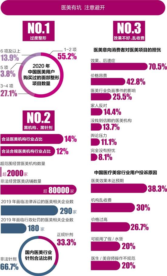 民营医美机构虽多,但消费者倾向于公立医院 虽然近年来医美市场发展迅速,天眼查数据显示,全国每年新增的医美相关企业数量由2015年的2215家逐年增长至2019年的10096万家。2015年,广东省新增医美相关企业数量仅8家,到了2019年,该项数据便达到352家。 但市场竞争格局仍处于分散的状态。天眼查数据显示,截至今年11月中旬,国内企业名称含医美或医疗美容,且状态为“在业、存续、迁入、迁出“的企业有4.49万家,其中53.04%为个体工商户。艾媒咨询数据则显示,国内医美机构中有10%为公立医院,10%为大型连锁医美集团,55%为中小型民营医美机构,以上三类均属于正规机构。此外,国内还有25%的医美机构并不正规,其本身是私人诊所或美容院。 消费者的需求与市场现状形成了较大反差。即便国内提供医美项目的公立医院比例并不高,但有45.4%的医美意向消费者倾向于选择一线城市公立医院,有32.5%的消费者倾向于选择当地公立医院,还有37.6%的意向消费者倾向于选择一线城市医美民营专业医院。各类型中,公立医院整容科室技术先进、经营正规,大型医美集团技术水平也较高,但两者都集中分布在一线城市或经济发达的东部沿海城市。而在国内分布广泛、占比较高的中小型民营机构则较难保证药品来源。 从成本结构看,以中小型民营机构为代表的不少医美机构把大量资金“砸入”营销。有数据显示,国内医美行业50%的成本是用于营销渠道,20%用于销售渠道,而用于耗材和人工的成本仅占10%和5%。这意味着,消费者付出的费用中,或只有很小一部分用于支付优质的医美产品或雇佣优秀的医美医生。实际上,即便超六成国内医美消费者在选择医美机构时主要会考虑医生资质,国内优秀的整形外科医生数量却并不多。2017年,中国每10万人口对应的整形外科医生数量只有0.3位,而韩国、巴西、美国和德国的该项数据分别为9.3位、2.6位、2.1位和1.4位。 在众多医美企业相继成立的过程中,全国范围内面临经营或司法风险的企业也在逐年增加。2015年,国内有失信信息、被执行人信息、法律诉讼、经营异常、行政处罚记录的企业分别为4家、19家、57家、15家和8家,而2019年的数据便分别达到52家、219家、290家、35家和128家。近5年内发生的3起严重违法事件也分布在2018年和2019年。据天眼查显示,这3家严重违法的企业分别是深圳市天使阁美容有限公司、深圳臻薇国际美容美妆有限公司和广东希莱医疗美容有限公司,3家严重违法均是因“通过登记的住所或经营场所无法联系的”且满了3年。 医美机构仍在野蛮生长,选择医美要小心避坑 在医美机构野蛮生长的时期,消费者选择医美项目需要避开不少坑。艾瑞咨询数据显示,2019年国内具备医疗美容资质的机构约1.3万家。在合法的医疗美容机构中,仍然存在15%的机构超范围经营。例如,部分诊所未设置整形外科,却开展了双眼皮手术。有的门诊部不可做三、四级手术项目,却开展了抽脂手术、颧骨降低术等,属于违规行为。此外,还有超过8万家非法经营店铺。 合法的医美医师占比也并不高。据艾瑞咨询统计,国内合法医美医师仅占行业的28%。由于来钱快、诱惑大,行业滋生了大量自称“医生、专家”的非法从业者。据中整协统计,仅通过非法培训机构短期速成的非法从业人员,人数就达到10万以上。而在合法医美机构中,也存在将近5000名非合规医师。艾瑞咨询提醒,消费者可通过卫健委网站服务栏或在线医美垂直平台,输入省份和医师名字查询医生执业资质及执业范围。 注射针剂也存在造假问题。有数据显示,去年国内医美行业的合规针剂比例只有33.3%,非法针剂则包括水货和假货。其中,假货有可能采用违禁成分或无效的生理盐水,也有可能成分含量不符合要求。水货则可能通过走私、个人携带等方式进入医美机构,其活性和安全性无法保障。而在非法机构中,超九成的非法医美机构使用的美容医疗设备也是假货。实际上,为了确保医美设备合法合规,可以通过医美光电设备上的二维码查询设备的归属单位。 需要警惕的是,黑医美机构中,医疗美容事故高发。艾瑞咨询指出,平均每年国内黑医美致残致死的人数小于1%。相比之下,正规医美机构的致残致死率低至千分之一。在国内医疗行业麻醉师缺口近30万人的背景下,医美公立医院麻醉致死概率约十万分之一,而医美民营医院或机构的麻醉致死概率约千分之一。艾瑞咨询相关报告表示,医美行业的合规化需要渗透到全产业链,而且是个长期的过程。行业急需监管机构进入整顿市场,且需要深入到产业链每个环节,以保障消费者利益。 可惜的是,进行医美消费后并不满意的消费者,本身对医美合法性的认知并不高。艾瑞咨询调研显示,有医美投诉意向的用户中,近三成用户没了解过或已知医美机构无相关医疗营业资质,近四成用户未了解过或已知医美医师无从业资质证明,近四成用户未了解过设备/针剂的购买渠道,超两成用户已知设备/针剂是假货或水货。在认知上,也有60.9%的医美用户将抽脂、隆胸丰臀、手术类面部整形和植发误认为是“轻医美”项目。 医美消费者本身过度依赖整形,则造成了过度整形的后果。有数据显示,年内购买过面部整形项目的消费者中,13.9%的消费者已进行过不少于6次的面部整形。若以做过大量面部整形项目的标准来衡量过度整形,则超一成的医美消费者有过度整形倾向。