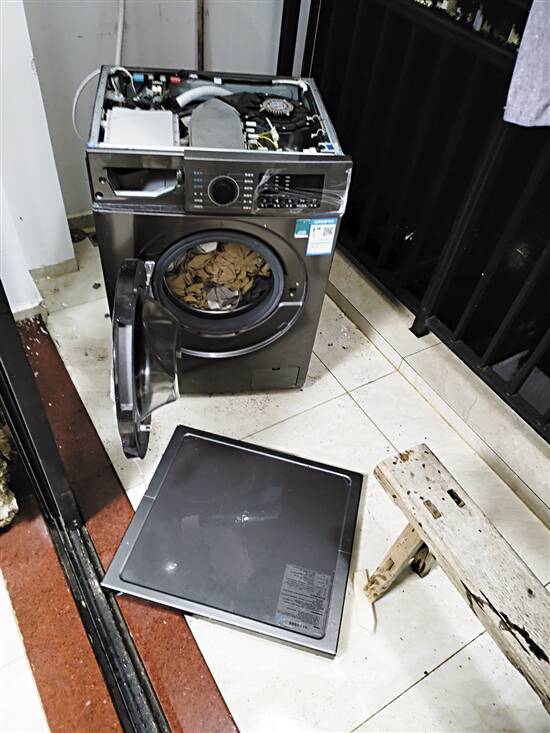 ■蒋先生称,他在事发当晚回家时,洗烘一体机的顶盖弹飞在地,里面的衣物已经烘干。受访者供图 |