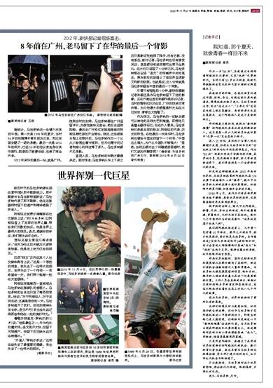 ■新快报记者 王敌 据统计,马拉多纳这一生曾六次来到中国。第一次是1996年的夏天,当时36岁的他随博卡青年到访北京,和北京国安踢了一场热身赛;最后一次是2012年的秋天,已经52岁的他以贵宾