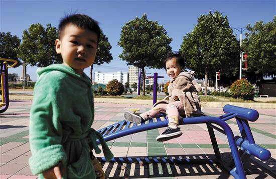 ■潮南两英镇崎沟村的活动广场里,两位小朋友在健身器材区玩耍。 |