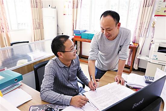 ■广州市海珠区赤岗街道办事处驻上漳村第一书记贾国胜(右)为贫困户郭海强及时解决就地就业问题。 |