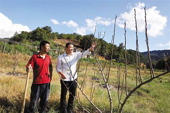 ■广州市海珠区凤阳街道办事处驻富岭村第一书记、扶贫工作队队长黎新锋带领着村里人种植沙梨。 |