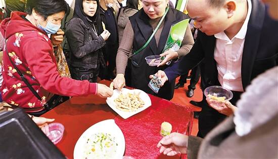 ■采写:新快报记者 曾贵真 ■摄影:新快报记者 宁 彪 “这个红薯真是太好吃了,哪里有得买?现在就买一箱回去。”“我特地坐207路车从茶漖过来买靓米的”……来自汕尾的扶贫好产品油占米、甘薯一展示,就受到参会嘉宾和广州街坊的热捧。 11月29日上午,“脱贫稻、小康薯”汕尾市扶贫产品展销会在广州市广东东西部扶贫协作产品交易市场举行。省农业农村厅扶贫协作与老区建设处一级调研员邓培熙,汕尾市委农办主任、农业农村局局长、扶贫办主任高火君,省农业农村厅农业综合执法监督处副处长付强,省农业农村厅扶贫开发指导处四级调研员陈咏,汕尾市委农办专职副主任李旭等出席活动。 好米靓红薯带动万余人增收 来自汕尾稀有剧种西秦戏的两位演员以《喜宴》《巡江南》演出拉开了展销会的序幕,这个源自甘肃的西秦戏,唱词虽然难懂,但美妙的唱调让大家听得如痴如醉。 高火君在致辞时表示,这次参展的“油占米”和“甘薯”都是汕尾的扶贫好产品。汕尾“海丰油占米”历史悠久,自明朝嘉靖年间以来不断改良,2019 年荣获国家名特优新产品和国家地理标志保护产品殊荣,是广东省大米的优质产品之一,是带动贫困群众增收的“脱贫稻”。陆丰甘薯自 2019 年陆丰市甘薯省级现代产业园建成以来,开发出了黄金板栗薯、甜蜜西瓜红、29 度蜜、“龙龙金”3 号等特色品种,出品的甘薯高颜值、高品质及高价格,是带动贫困群众脱贫的“小康薯”。 这两种特色产品带动了全市一万多名有劳动能力的贫困群众增收脱贫,是汕尾市比较有代表性的扶贫产品。举办这场展销活动,就是为了让更多贫困群众挑上“金扁担”,让更多汕尾优质扶贫农产品飘香全省、全国。 邓培熙表示,汕尾市举办这场“脱贫稻、小康薯”展销会,除了向社会各界展示汕尾扶贫成果外,更重要的是为各企业搭建一个产销对接平台,助推贫困户增收脱贫。希望社会各界人士一如既往地支持汕尾、关心汕尾、给力汕尾。 会上,汕尾市合利电子商务有限公司还与广东省餐饮服务行业协会、广州广粤文化发展有限公司、广东客语餐饮管理有限公司、大嘴猫火锅连锁有限公司等企业举行了签约仪式。 “太好吃了!现在就买一箱” 展销会上,四名礼仪小姐展示了用海丰油占米做成的香喷喷的米饭,用陆丰甘薯做成的反沙番薯、番薯糖水等美食,给会场上的嘉宾和广州街坊留下了深刻印象。 会议结束后,参会嘉宾围绕会场两侧的油占米和甘薯展区进行参观。“不错不错,这个烤红薯真的好好吃。”听到嘉宾称赞,高火君说:“烤红薯很讲究手法,要烤到不粘手又好吃才是水平。” 现场,街坊们围着试吃档的反沙番薯轮流试吃,不时发出赞叹声。一位参会嘉宾更当场问:“这个红薯真是太好吃了,哪里有得买?现在就买一箱回去。” 几位阿姨则直接奔向丰隆、稻润丰等油占米的摊位,人手一两包买走。一位阿姨告诉新快报记者,她们是收到这里有靓米买的“料”后,一早特地从茶漖村坐207路车过来的。“我也不记得坐了多少个站了,就是感觉有好东西必须来看看。”她说。记者查阅高德地图发现,从茶漖村坐车过来,有十几个站,坐车差不多要一个小时。