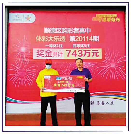 新快报讯 记者陆妍思 通讯员顺彩报道 大乐透第20114期开奖中,顺德体彩迎来了今年第三个大乐透大奖。当期全国共中出6注一等奖,其中1注花落顺德区大良南国中路尚景苑39号的4422030060体彩实体店。购彩者凭一张12元的“6+2”复式票,揽获一等奖1注、四等奖5注,单票中奖金额高达743万元。 中奖者兑奖: 老婆也开始关注大乐透 近日,中奖者张先生(化名)来到顺德体彩中心领奖。张先生表示得知中奖的这几天一直有点小紧张,短短几天时间感觉好像好漫长。这次终于亲手领到大奖支票,倍感喜悦。张先生还透露,自从中得大奖后,老婆也开始关注体彩,时不时买上几注大乐透娱乐一番。至于奖金如何使用,张先生表示,打算用于置业和生活上的开销。他会继续工作,劳动至上。 经统计,今年以来,顺德购彩者已经3次中得大乐透500万元以上大奖,中奖喜报一个接着一个。每位购彩者所购买的每一张中国体育彩票,都有一定比例金额纳入体彩公益金。截止至10月份,顺德体彩中心已为国家筹集公益金8575万元。对于每一位购彩者,每买一张彩票都为自己种下了一颗希望的种子,同时也随手圆了自己的公益梦。体彩大乐透在助力购彩者收获幸运、为生活添彩的同时,也为体育事业和社会公益事业助力。 为实体店颁奖: 业主销售员获现金奖励 11月25日,顺德体彩为中出大乐透743万元大奖实体店举行了颁奖仪式。随着锣鼓声响、醒狮起舞,现场吸引了不少街坊邻里前来道贺,一起分享幸运大奖的喜悦。顺德体彩中心主任郑江涛接受采访表示:“今年比较幸运,顺德体彩已经中出了3次大乐透一等奖,我们替中奖者感到很高兴。接下来我们会做好体彩门店的建设工作,保证安全销售,提升门店形象和服务。” 颁奖仪式上,顺德区文化广电旅游体育局副局长陈智聪为该实体店颁发“幸运投注站”牌匾,顺德体彩中心主任郑江涛为实体店业主颁发5000元奖金,大良街道宣传文体旅游办公室副主任陈金虎为销售员颁发幸运销售员1000元奖金。活动现场还免费派发了大乐透彩票、体彩小礼品,让更多的人都能沾沾大奖的喜庆,收获一份属于自己的小幸运。 本次出奖的4422030060体彩实体店是一家夫妻店,开业已有5年时间了。平时由夫妻二人携手打理,他们相互扶持,坚持以购彩者服务至上。谈及这次门店喜中大奖,业主罗先生表示内心感到很平静,因为他一直觉得大奖总有一天会到来。