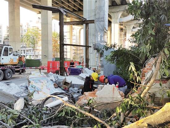 ■工人们正在清理现场。新快报记者 林钢威/摄 |