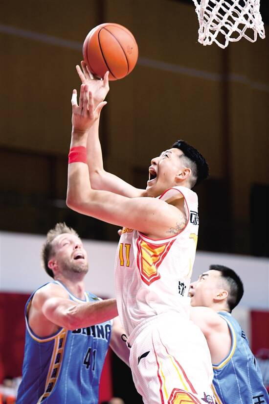 ■深圳马可波罗队球员沈梓捷(中)在比赛中上篮。新华社发 |