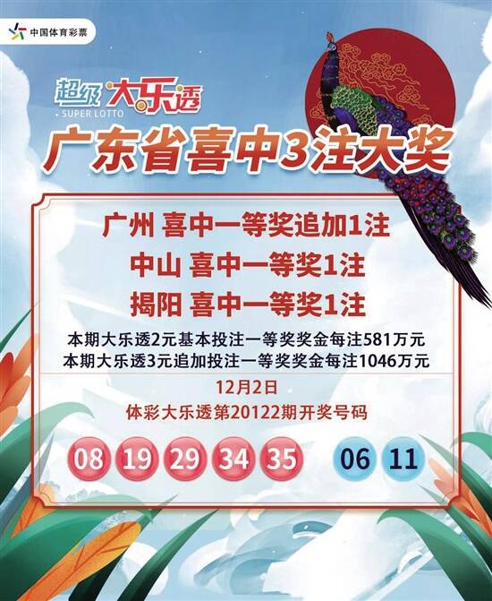 新快报讯 记者陆妍思报道 12月2日,体彩大乐透第20122期开奖,当期全国共中出10注一等奖,广东揽得3注成为大赢家,其中广州中出全国唯一的1046万元追加投注一等奖,中山、揭阳也各捧得1注581万元基本投注一等奖。 大乐透第20122期的中奖号码为:前区“08、19、29、34、35”;后区“06、11”。当期全国开出10注一等奖。其中1注1046万元(含465万元追加奖金)追加投注一等奖,花落广东广州;另外9注581万元基本投注一等奖,分别为江苏泰州、浙江杭州、福建泉州、湖北黄石、山东青岛、广东中山、广东揭阳各1注,山东菏泽2注。 据广东省体彩中心检查,花落广州的追加一等奖,出自荔湾区黄沙大道175号之四的4401001517体彩实体店,中奖的彩票是一张90元15期的“前区5拖+后区1胆2拖”的胆拖票,该票除中得1注追加一等奖外,还擒获1注追加二等奖,单票总奖金1055万余元。 花落中山的基本一等奖,出自中山市西区旗山花园10号的4418018307体彩实体店,中奖的彩票是一张126元“7+3”的复式票,该票除中得1注基本一等奖外,还收获2注基本二等奖、10注四等奖、20注五等奖、10注六等奖、20注八等奖,单票总奖金595万余元。 花落揭阳的基本一等奖,出自揭阳流沙龙宛新村第一幢起第一二层的4420020149体彩实体店,中奖的彩票是一张42元“7+2”的复式票,该票除中得1注基本一等奖外,还收获10注四等奖和10注六等奖,单票总奖金584万余元。 由于中山、揭阳的中奖者没有采用追加投注,对比起广州的头奖得主,在单注一等奖方面,少拿了465万元追加奖金,从而错过中得千万头奖的机会。 同期二等奖中出145注,单注奖金5.04万元。其中58注为追加投注,每注多得奖金4.03万元。追加后,二等奖单注总奖金为9.07万元。 当期全国销量为2.81亿元,为国家筹集彩票公益金1.01亿元。奖池方面,本期开奖结束后,6.29亿元滚存至12月5日(周六)开奖的第20123期。