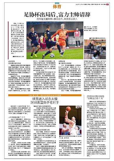 前晚,广州富力在足协杯第三轮比赛中以6∶7不敌山东鲁能,就此结束了2020赛季的全部比赛。赛后,富力主帅范布隆克霍斯特主动请辞。斟酌再三,富力俱乐部同意了他的辞职。昨天下午,范布隆克霍斯特在接受采