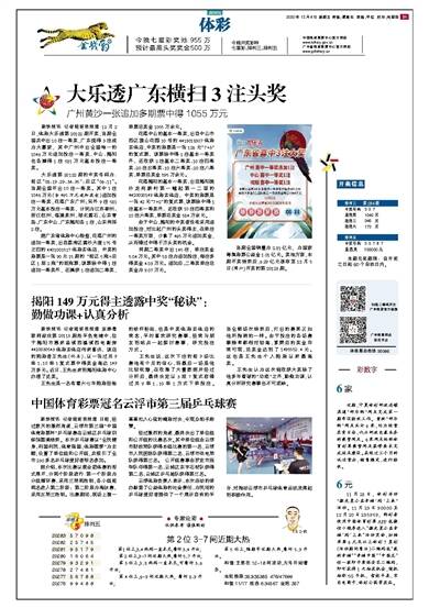 新快报讯 记者陆妍思报道 12月2日,体彩大乐透第20122期开奖,当期全国共中出10注一等奖,广东揽得3注成为大赢家,其中广州中出全国唯一的1046万元追加投注一等奖,中山、揭阳也各捧得1注58