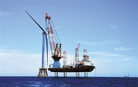 ■广东省内装机容量最大海上风电项目——阳江南鹏岛珍珠湾海上风电项目进行风机叶轮吊装。(谭文强 摄) |