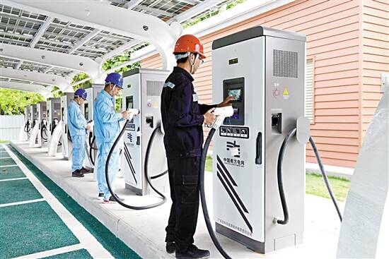 ■南方电网广东东莞供电局供电人员为松山湖太鲁阁光储充项目进行调试。 (顾萱 摄) |