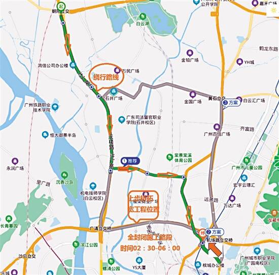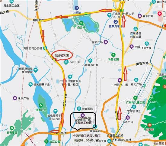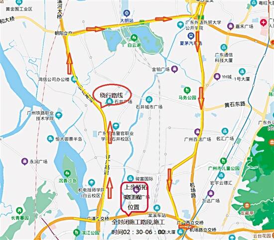 因建设上步桥拓宽工程需要,2020年12月21日、2020年12月23日、2020年12月26日、2020年12月29日进行上步桥拓宽工程跨北环高速公路段钢箱梁施工,施工影响路段为北环高速公路增槎路至广花出口路段,施工时将进行全封闭施工(施工作业时间为02:30至06:00,施工期间将采取间断施工的措施,每次全封闭施工约15分钟,每晚1至2次,其余时间车辆正常通行)。 途经车辆绕行路线如下: 一、东行去往三元里沙河立交方向: 北环高速东行方向车辆至主干道往增槎路匝道口处,绕行增槎路口→广清立交→许广高速→朝阳立交→鸦岗大道→华南快速干线→平沙立交→机场高速→北环高速(如图一) 二、西行去往广清出口方向: 北环高速西行方向车辆至三元里出口处,绕行三元里出口→机场高速→平沙立交→华南快速干线→鸦岗大道→朝阳立交→许广高速→广清立交→北环高速(如图二) 三、许广高速公路南行去往北环高速公路东行方向: 许广高速南行住北环高速公路东行方向车辆,绕行许广高速→增槎路→庆槎路→西槎路→德康路→三元里大道→三元里入口→北环高速(如图三) 以上计划时间如遇恶劣天气顺延,施工期间请过往司机服从现场交警、路政及交通疏导员指挥,建议驾驶人员提前规划出行线路。 广州市第一市政工程有限公司 2020年12月10日