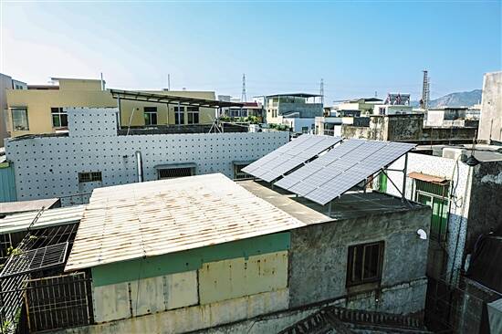 ■汕头市金平区鮀江街举登社区蔡鸿璇家的屋顶上架起光伏发电设备。 |