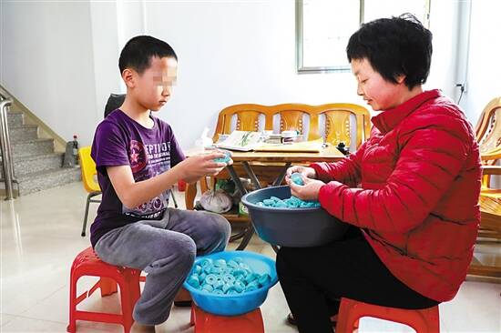 ■在汕头市金平区鮀莲街天港社区,邹满风和孩子一起组装着塑料小零件。 |
