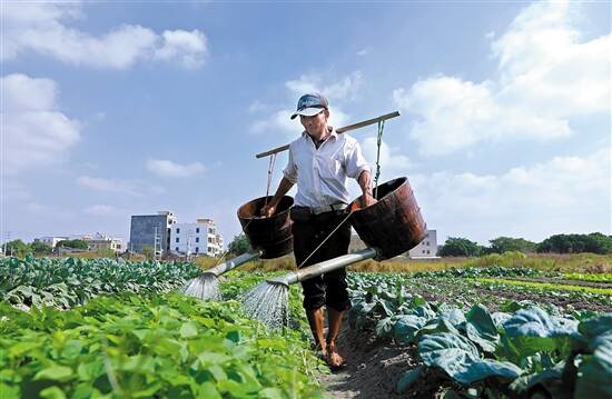 ■汕头市潮南区平湖西社区的村民郑兴连正在田里浇水。他高兴地告诉记者,地里收成一年好过一年,菜不愁卖了。 |