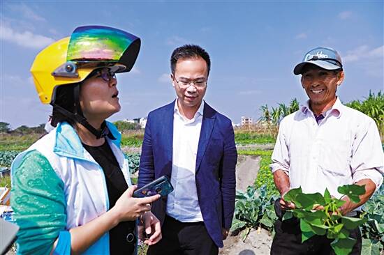 ■郑兴连带着汕头市潮南区平湖西社区驻村第一书记连俊丰(中)看地里收成。 |