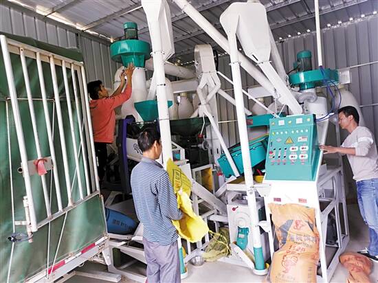 ■云浮市郁南县南江口镇河塱村合作社成员正在碾米、打包。 |