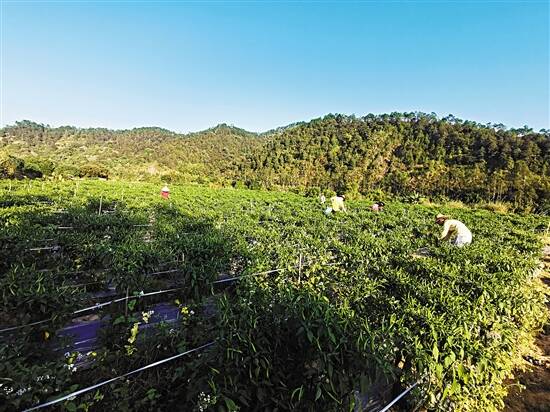 ■云浮市郁南县南江口镇河塱村村民在陈金波的辣椒地里采摘辣椒。 |