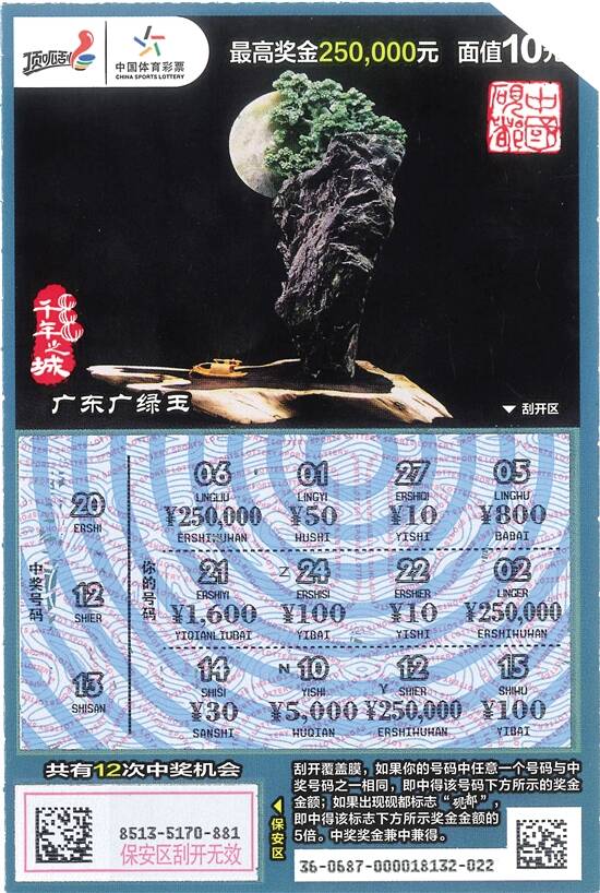 新快报讯 记者陆妍思报道 “中国砚都”系列即开票自12月5日在广东正式上市以来,广州购彩者上演帽子戏法,继上周摘得两个头奖后,本周再爆一个! 最新中出的头奖出自“千年之城”系列,落在广州越秀区诗书路112号的4401023858实体店。中奖人炎先生(化名)说,他是该彩票店的老主顾,“帮衬了20多年了,大家都是街坊街里。”他透露,当天他经过彩票店,店里网络出现故障,店主和维修工正在抢修,店主拜托他帮忙照看一下店面:“干坐着挺无聊的,看见他即开票的展示柜里面还有一些新票,就全要了,9张。前面8张都没有收获的,本来想着今天又‘食白果’(即一场空),没想到最后一张有料到!” 炎先生说,他刚刮出大奖时,自己都不相信的,马上给店主看:“他一看就说‘你得上体彩中心领奖了’,那不就是真中头奖了嘛!” 据了解,12月5日正式在粤上市的“中国砚都”文化系列即开票以肇庆历史文化、秀丽风景、体育运动为主要元素,由广东省自主设计、开发,并由国家体育总局、财政部批准发行。包含“千年之城”“山水之城”“运动之城”三个票种,共12张票面,分5元、10元两种面值,最高奖金可中25万元。 为新票上市助兴,目前,广东体彩同步开展“千年砚都 奖金翻番”即开票促销活动,2020年12月5日至2021年1月5日,在广东省购买“千年之城”“山水之城”“运动之城”三款活动票种,单张中奖800、900、1000元,即可获赠同等金额即开票。活动赠票总金额100万元,如赠票资金提前赠送完毕,赠票活动截至资金送完当日24:00;如活动期间赠票资金未使用完,活动按时结束。