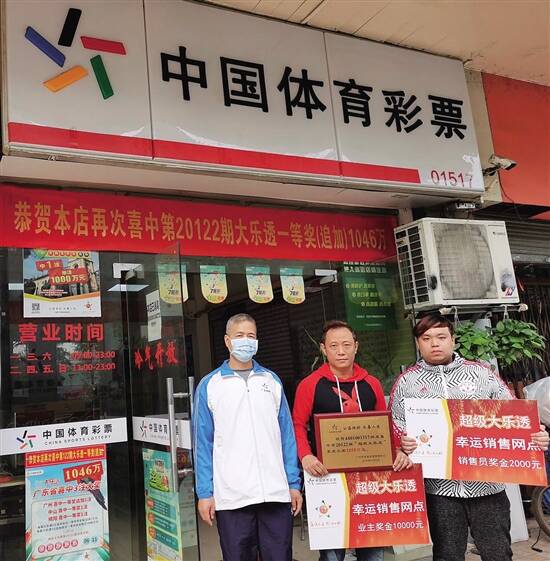 新快报讯 记者陆妍思 通讯员李琪报道 12月9日,广州体彩中心为荔湾区黄沙大道175号之四的4401001517实体店举行了颁奖庆祝仪式。今年该店“牛气冲天”:5月20日曾中出第20039期大乐透1000万元头奖,遗憾的是因中奖人未能在有效期内兑奖而弃奖;然而上天又一次眷顾该店购彩者,12月2日,该店再度中得第20122期大乐透1055万元复式大奖,可谓“一年抱两”!该实体店荣获“幸运实体店”称号,其业主获奖励金10000元,销售员获奖励金2000元。 本次中奖的彩票是一张90元15期的“前区5拖+后区1胆2拖”的胆拖票。目前,中奖人仍未现身兑奖。广州体彩中心提醒曾在该店通过多期连投方式购买大乐透的购彩者,仔细查看手上的彩票,切勿因疏忽大意错失守候多时的大奖。