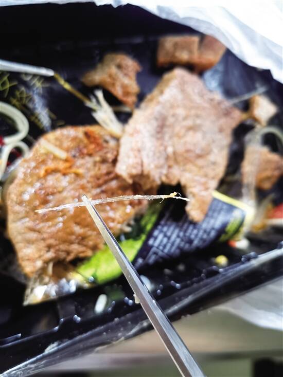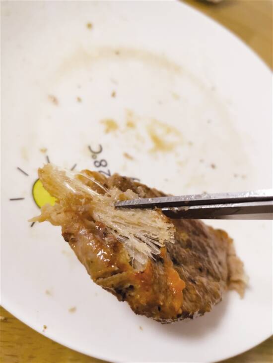 ▲吴女士发现的牛扒内异状物。受访者供图 单独用镊子夹起的条状异状物。受访者供图 |